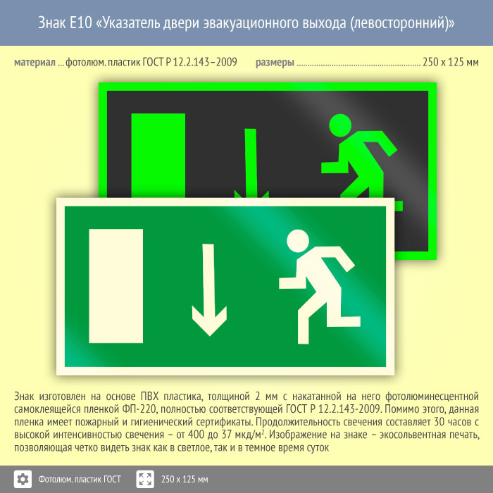 Знак E10 «Указатель двери эвакуационного выхода (левосторонний)» (фотолюминесцентный пластик ГОСТ 34428-2018, 250х125 мм) в Ульяновске купить