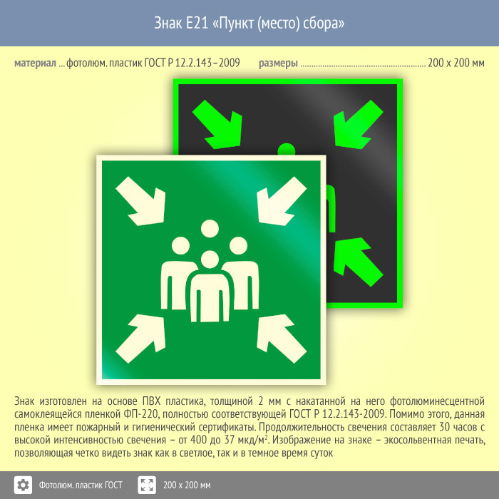 Знак E21 «Пункт (место) сбора» (фотолюминесцентный пластик ГОСТ 34428-2018, 200х200 мм) в Ульяновске купить