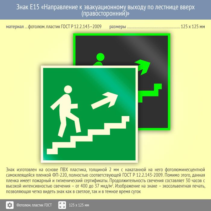 Знак E15 «Направление к эвакуационному выходу по лестнице вверх (правосторонний)» (фотолюминесцентный пластик ГОСТ 34428-2018, 125х125 мм) в Ульяновске купить