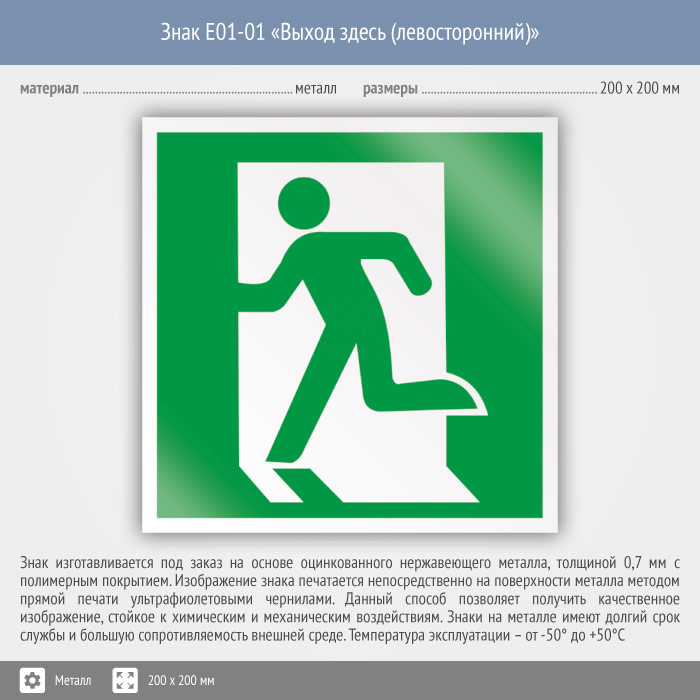 Знак E01-01 «Выход здесь (левосторонний)» (металл, 200х200 мм) в Ульяновске купить