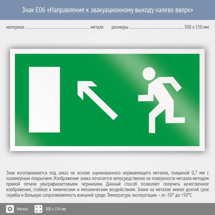Знак E06 «Направление к эвакуационному выходу налево вверх» (металл, 300х150 мм) в Ульяновске купить