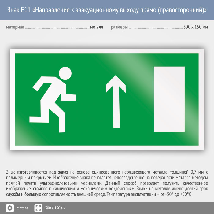 Знак E11 «Направление к эвакуационному выходу прямо (правосторонний)» (металл, 300х150 мм) в Ульяновске купить