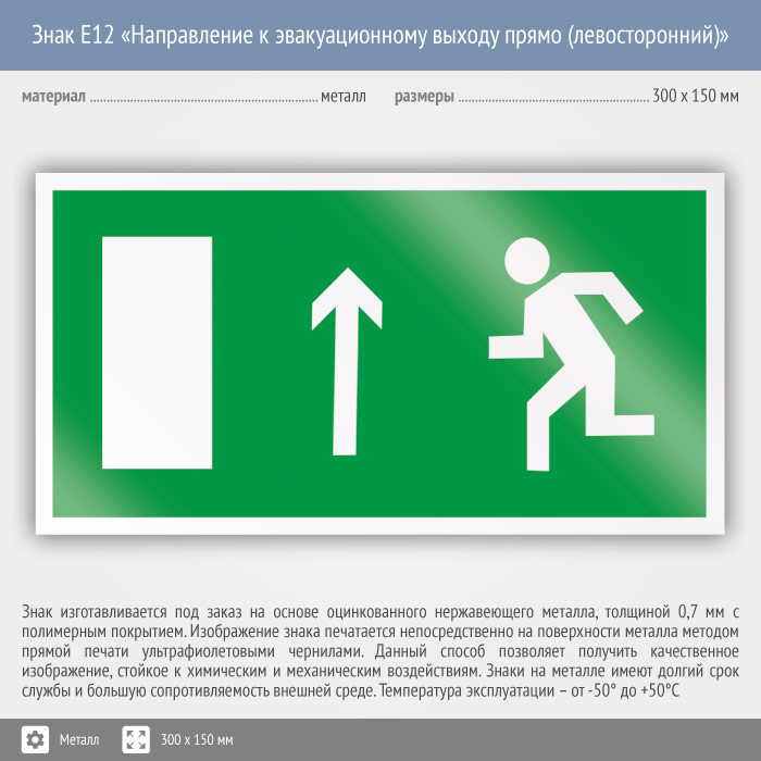 Знак E12 «Направление к эвакуационному выходу прямо (левосторонний)» (металл, 300х150 мм) в Ульяновске купить