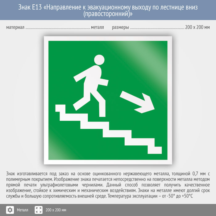 Знак E13 «Направление к эвакуационному выходу по лестнице вниз (правосторонний)» (металл, 200х200 мм) в Ульяновске купить