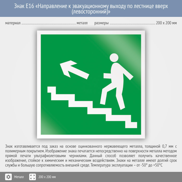 Знак E16 «Направление к эвакуационному выходу по лестнице вверх (левосторонний)» (металл, 200х200 мм) в Ульяновске купить