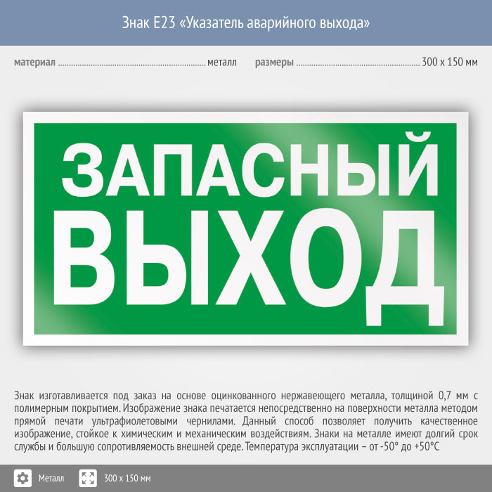Знак E23 «Указатель запасного выхода» (устаревший) (металл, 300х150 мм) в Ульяновске купить