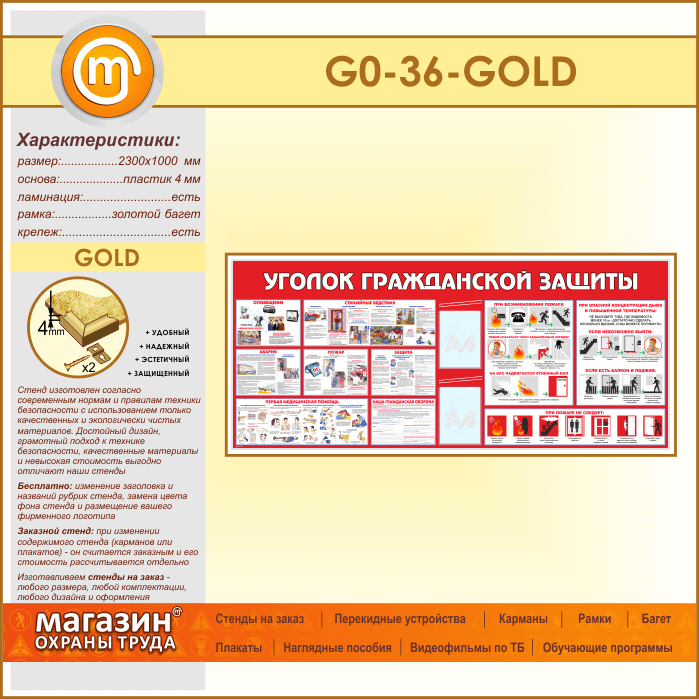 Стенд «Уголок гражданской защиты» c 2 карманами (GO-36-GOLD) в Ульяновске купить