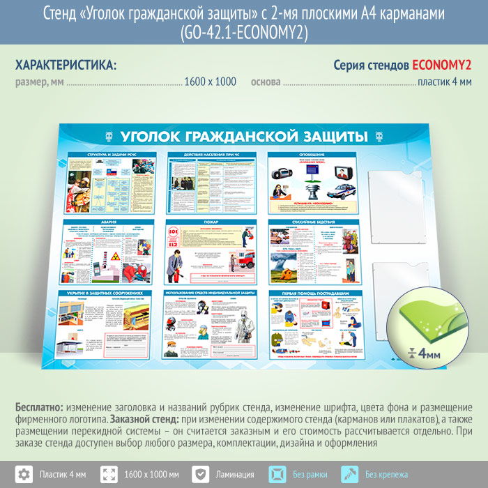 Стенд «Уголок гражданской защиты» с 2-мя плоскими А4 карманами (GO-42.1-ECONOMY2) в Ульяновске купить