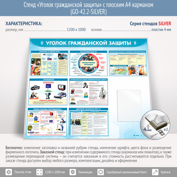 Стенд «Уголок гражданской защиты» с плоским А4 карманом (GO-42.2-SILVER) в Ульяновске купить