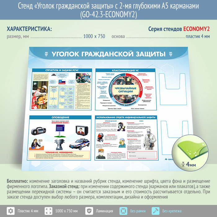 Стенд «Уголок гражданской защиты» с 2-мя глубокими А5 карманами (GO-42.3-ECONOMY2) в Ульяновске купить