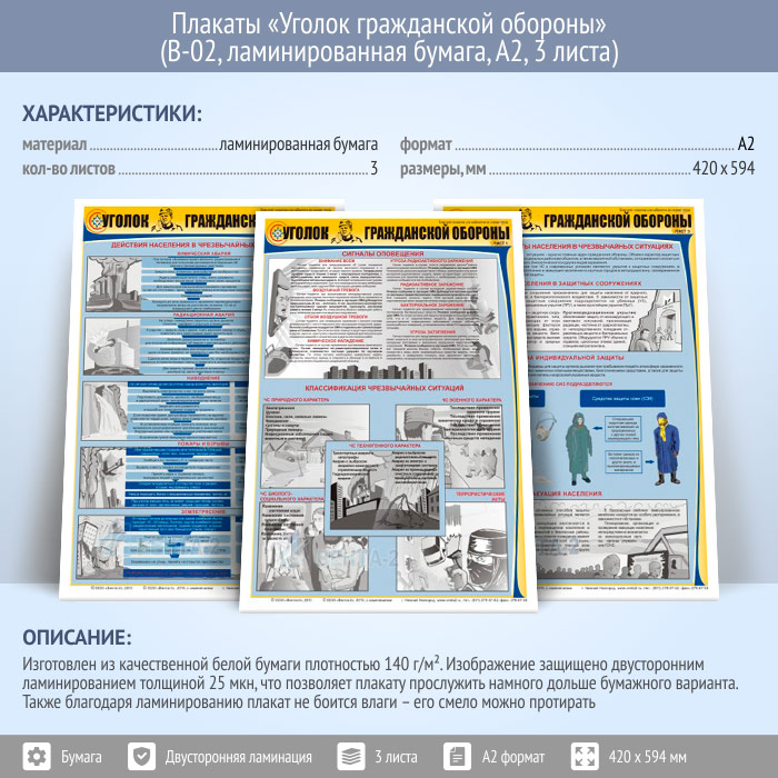 Плакаты «Уголок гражданской обороны» (В-02, ламинированная бумага, А2, 3 листа) в Ульяновске купить