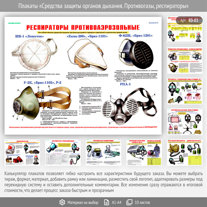Плакаты «Средства защиты органов дыхания. Противогазы, респираторы» (ВЗ-03, 10 листов) в Ульяновске купить