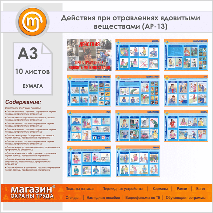 Плакаты «Действия при отравлениях ядовитыми веществами» (АР-13, бумага, А3, 10 листов) в Ульяновске купить