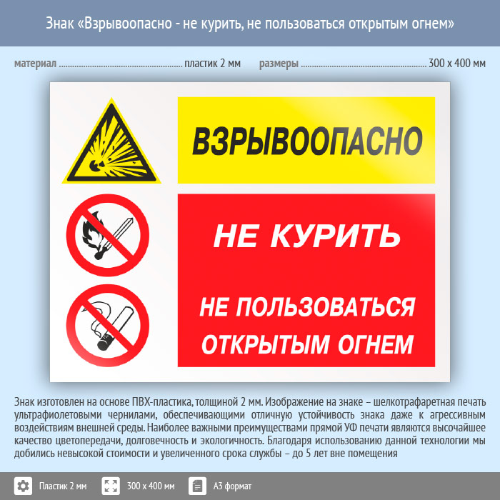 Знак «Взрывоопасно - не курить, не пользоваться открытым огнем», КЗ-05 (пластик, 400х300 мм) в Ульяновске купить