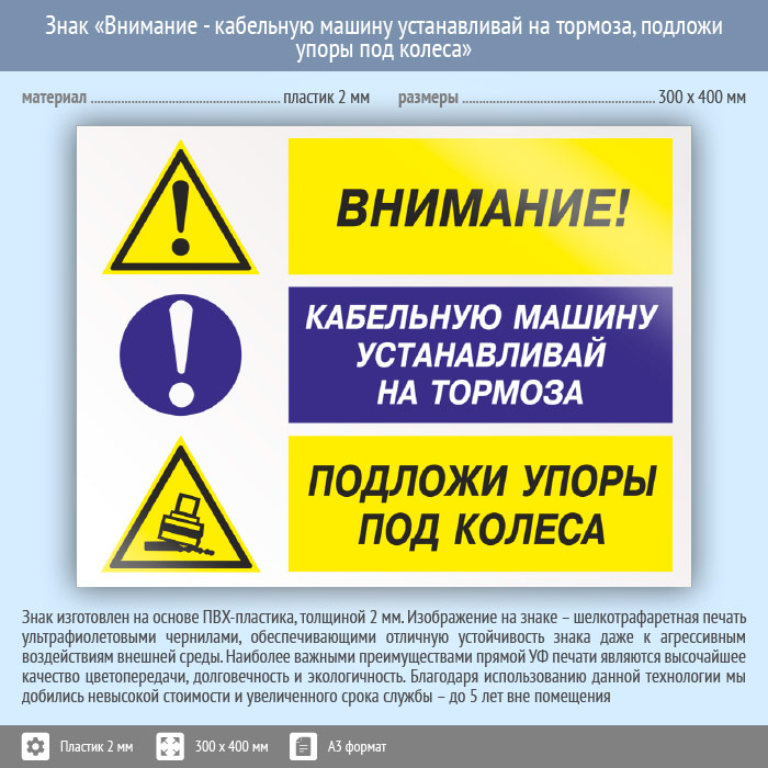 Знак «Внимание - кабельную машину устанавливай на тормоза, подложи упоры под колеса», КЗ-12 (пластик, 400х300 мм) в Ульяновске купить