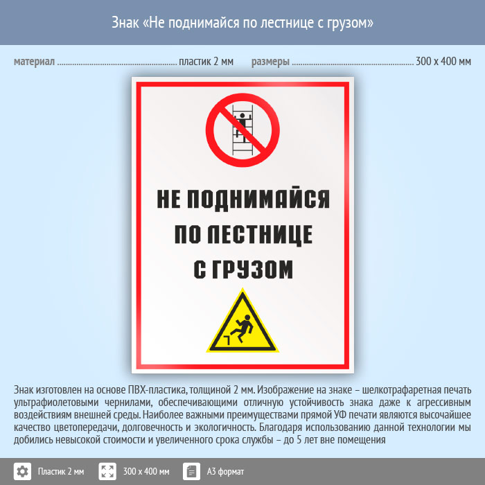 Знак «Не поднимайся по лестнице с грузом», КЗ-28 (пластик, 300х400 мм) в Ульяновске купить