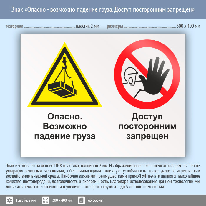 Знак «Опасно - возможно падение груза. Доступ посторонним запрещен», КЗ-33 (пластик, 400х300 мм) в Ульяновске купить