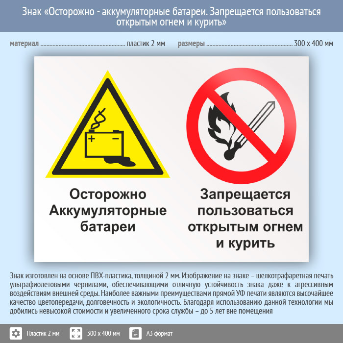 Знак «Осторожно - аккумуляторные батареи. Запрещается пользоваться открытым огнем и курить», КЗ-50 (пластик, 400х300 мм) в Ульяновске купить
