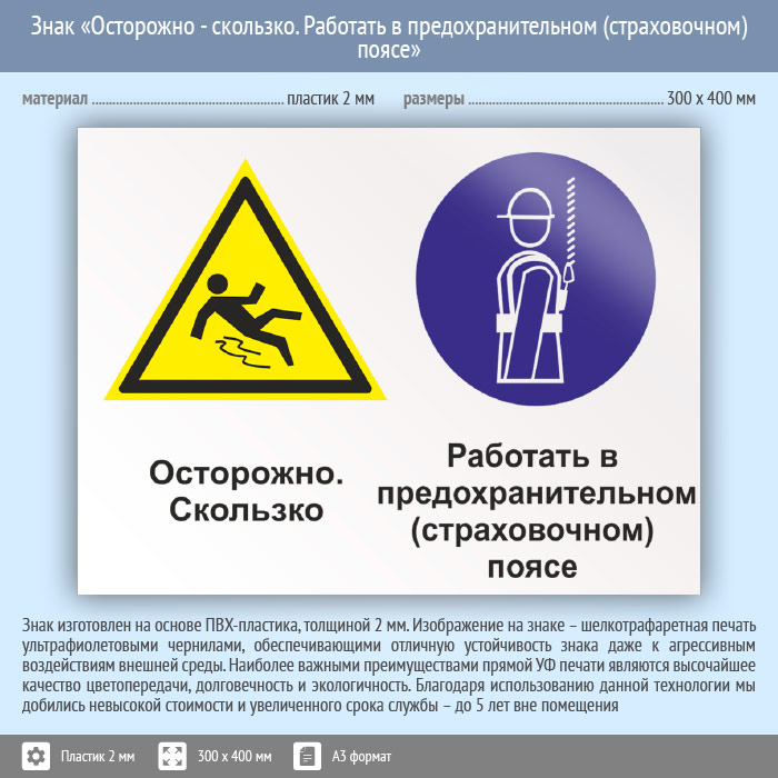 Знак «Осторожно - скользко. Работать в предохранительном (страховочном) поясе», КЗ-58 (пластик, 400х300 мм) в Ульяновске купить