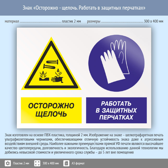 Знак «Осторожно - щелочь. Работать в защитных перчатках», КЗ-60 (пластик, 400х300 мм) в Ульяновске купить