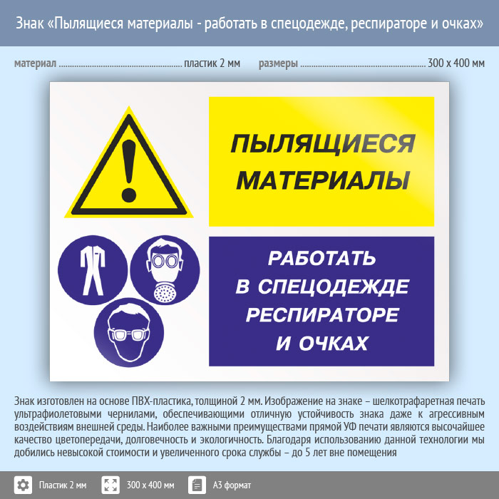 Знак «Пылящиеся материалы - работать в спецодежде, респираторе и очках», КЗ-79 (пластик, 400х300 мм) в Ульяновске купить