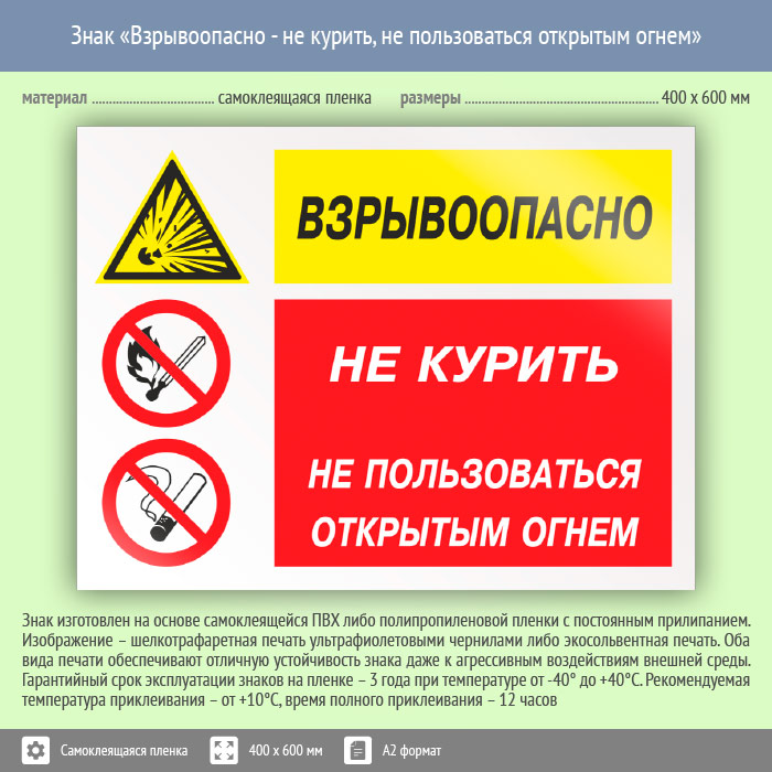Знак «Взрывоопасно - не курить, не пользоваться открытым огнем», КЗ-05 (пленка, 600х400 мм) в Ульяновске купить