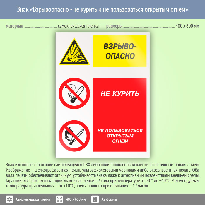 Знак «Взрывоопасно - не курить и не пользоваться открытым огнем», КЗ-08 (пленка, 400х600 мм) в Ульяновске купить