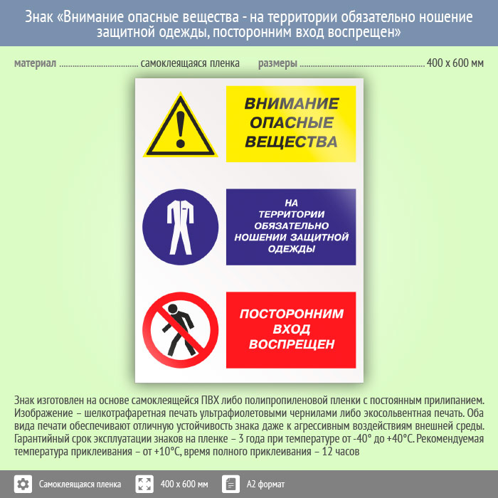 Знак «Внимание опасные вещества - на территории обязательно ношение защитной одежды, посторонним вход воспрещен», КЗ-15 (пленка, 400х600 мм) в Ульяновске купить