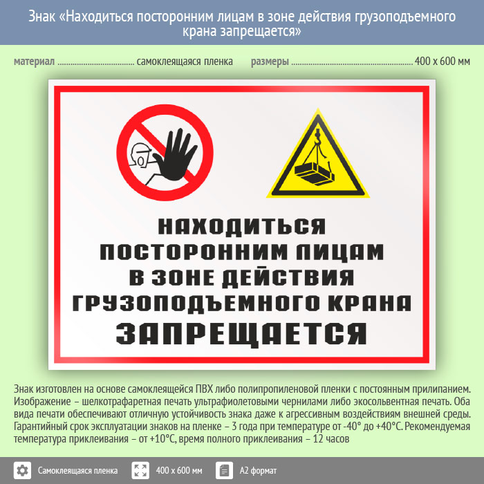 Знак «Находиться посторонним лицам в зоне действия грузоподъемного крана запрещается», КЗ-23 (пленка, 600х400 мм) в Ульяновске купить