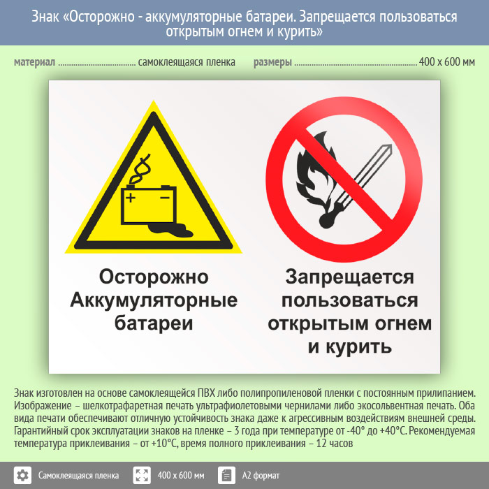Знак «Осторожно - аккумуляторные батареи. Запрещается пользоваться открытым огнем и курить», КЗ-50 (пленка, 600х400 мм) в Ульяновске купить