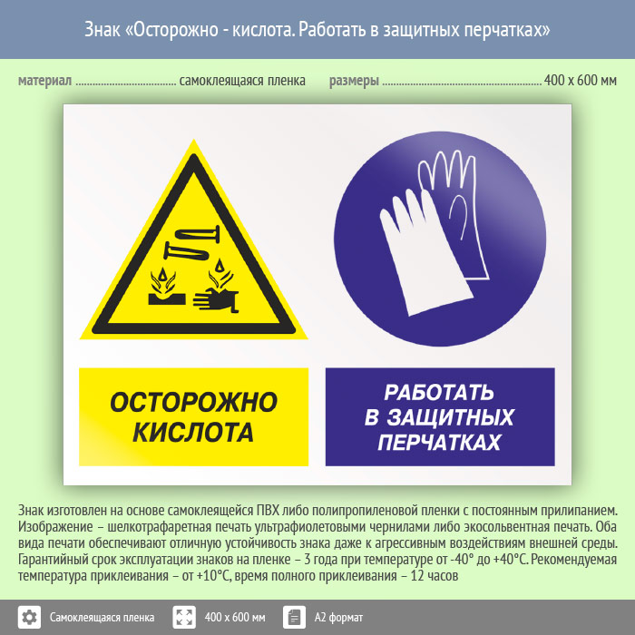 Знак «Осторожно - кислота. Работать в защитных перчатках», КЗ-56 (пленка, 600х400 мм) в Ульяновске купить