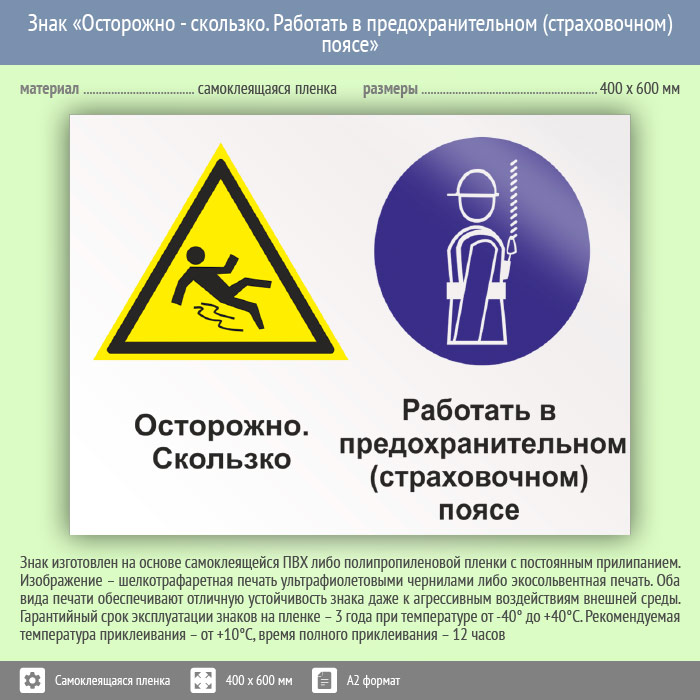 Знак «Осторожно - скользко. Работать в предохранительном (страховочном) поясе», КЗ-58 (пленка, 600х400 мм) в Ульяновске купить