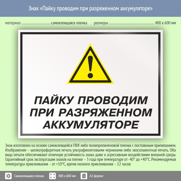 Знак «Пайку проводим при разряженном аккумуляторе», КЗ-62 (пленка, 600х400 мм) в Ульяновске купить