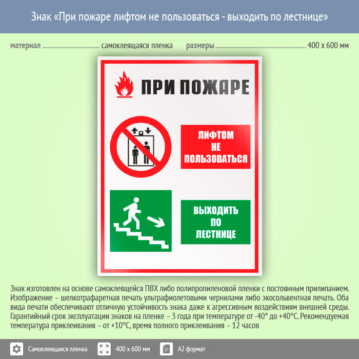 Знак «При пожаре лифтом не пользоваться - выходить по лестнице», КЗ-73 (пленка, 400х600 мм) в Ульяновске купить