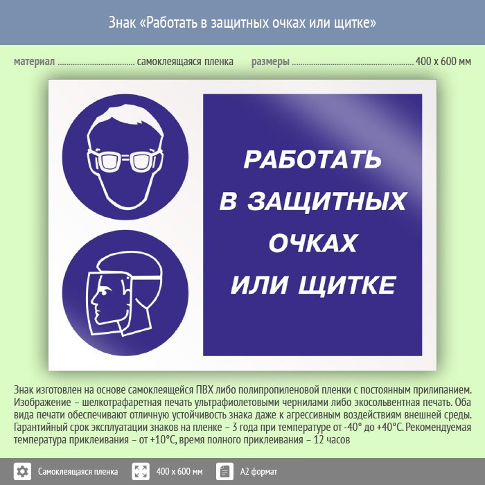Знак «Работать в защитных очках или щитке», КЗ-80 (пленка, 600х400 мм) в Ульяновске купить