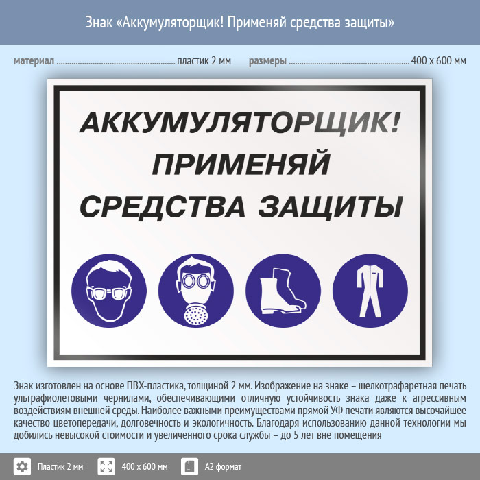 Знак «Аккумуляторщик! Применяй средства защиты», КЗ-02 (пластик, 600х400 мм) в Ульяновске купить