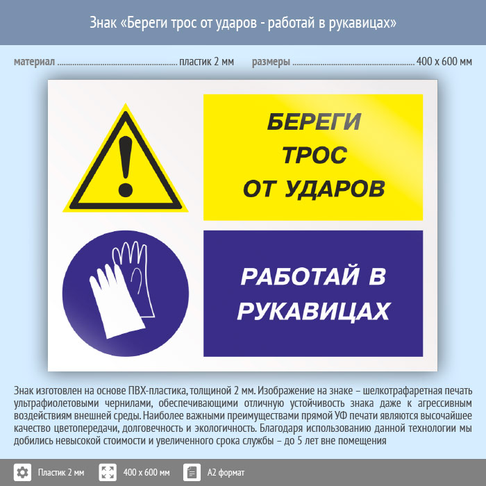 Знак «Береги трос от ударов - работай в рукавицах», КЗ-03 (пластик, 600х400 мм) в Ульяновске купить