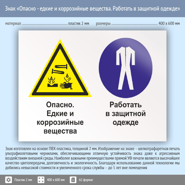 Знак «Опасно - едкие и коррозийные вещества. Работать в защитной одежде», КЗ-35 (пластик, 600х400 мм) в Ульяновске купить
