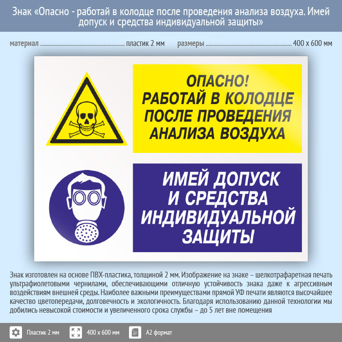 Знак «Опасно - работай в колодце после проведения анализа воздуха. Имей допуск и средства индивидуальной защиты», КЗ-40 (пластик, 600х400 мм) в Ульяновске купить
