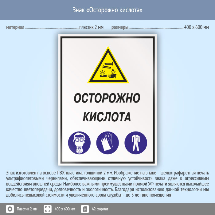Знак «Осторожно кислота», КЗ-61 (пластик, 400х600 мм) в Ульяновске купить