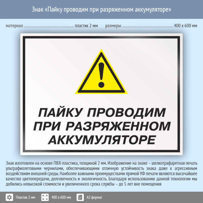 Знак «Пайку проводим при разряженном аккумуляторе», КЗ-62 (пластик, 600х400 мм) в Ульяновске купить