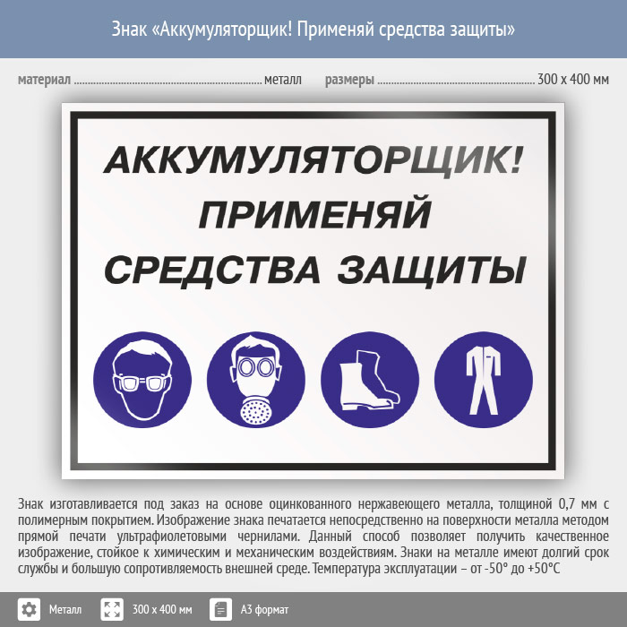 Знак «Аккумуляторщик! Применяй средства защиты», КЗ-02 (металл, 400х300 мм) в Ульяновске купить
