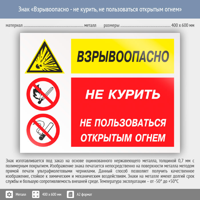 Знак «Взрывоопасно - не курить, не пользоваться открытым огнем», КЗ-05 (металл, 600х400 мм) в Ульяновске купить