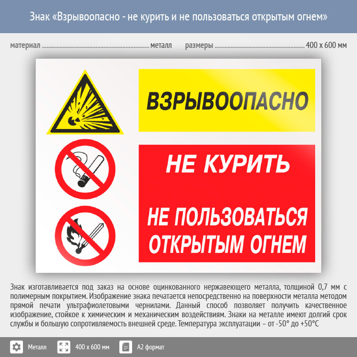 Знак «Взрывоопасно - не курить и не пользоваться открытым огнем», КЗ-09 (металл, 600х400 мм) в Ульяновске купить