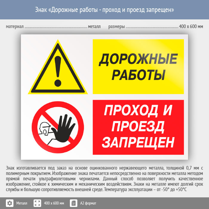 Знак «Дорожные работы - проход и проезд запрещен», КЗ-20 (металл, 600х400 мм) в Ульяновске купить