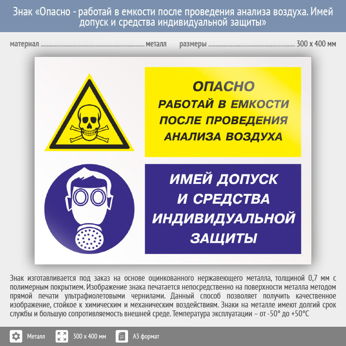 Знак «Опасно - работай в емкости после проведения анализа воздуха. Имей допуск и средства индивидуальной защиты», КЗ-39 (металл, 400х300 мм) в Ульяновске купить