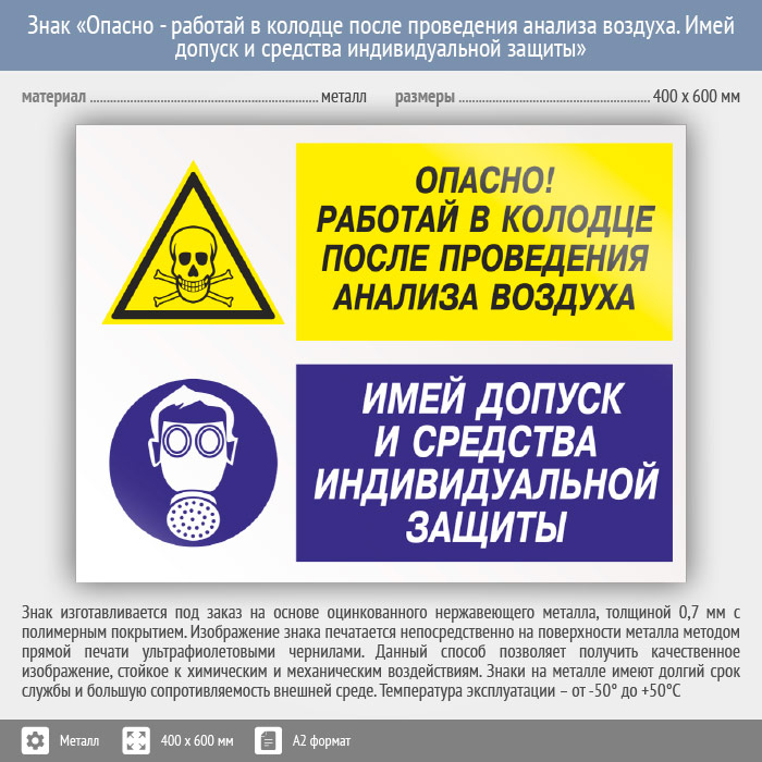 Знак «Опасно - работай в колодце после проведения анализа воздуха. Имей допуск и средства индивидуальной защиты», КЗ-40 (металл, 600х400 мм) в Ульяновске купить