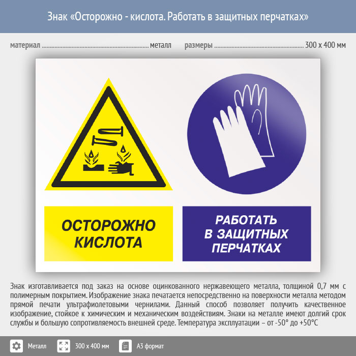 Знак «Осторожно - кислота. Работать в защитных перчатках», КЗ-56 (металл, 400х300 мм) в Ульяновске купить