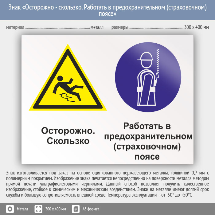 Знак «Осторожно - скользко. Работать в предохранительном (страховочном) поясе», КЗ-58 (металл, 400х300 мм) в Ульяновске купить