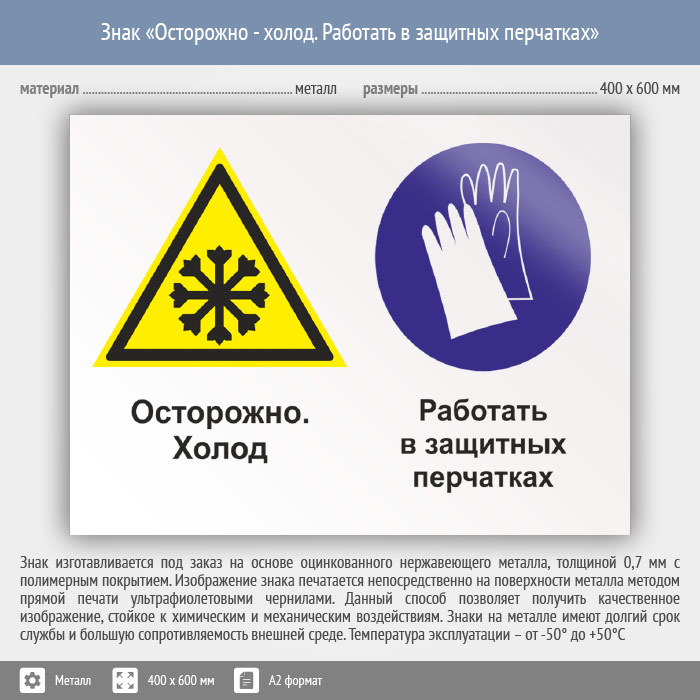 Знак «Осторожно - холод. Работать в защитных перчатках», КЗ-59 (металл, 600х400 мм) в Ульяновске купить